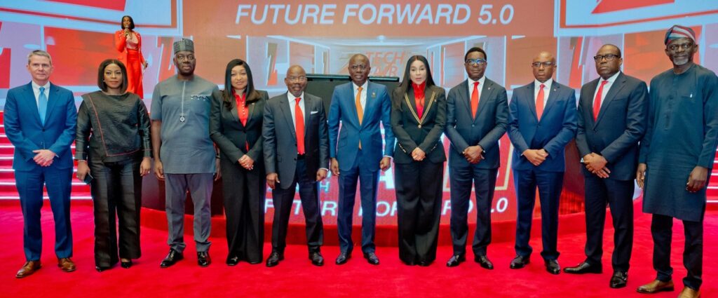 L-R: Executive Vice President, CNN International Commercial, Phil Nelson; Founder & CEO, Beyond Limits Africa and Non-Executive Director, Zenith Bank, Dr. Juliet Ehimuan; Managing Director/CEO, NIBSS, Premier Oiwoh; Executive Director, Zenith Bank, Mrs. Adobi Nwapa; Founder & Chairman, Zenith Bank, Jim Ovia, CFR; Governor of Lagos State, Mr. Babajide Sanwo-Olu; Group Managing Director/CEO, Zenith Bank, Dame Dr. Adaora Umeoji, OON; Executive Director, Zenith Bank, Mr. Akin Ogunranti; Executive Director, Zenith Bank, Mr. Louis Odom; Executive Director, Zenith Bank, Mr. Adamu Lawani; and Director, Information Technology Infrastructure Solutions, NITDA, Mr. Oladejo Olawumi during the Zenith Bank Tech Fair Future Forward 5.0 held at the Eko Convention Centre, Eko Hotels & Suites, Victoria Island, Lagos, recently.